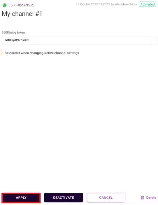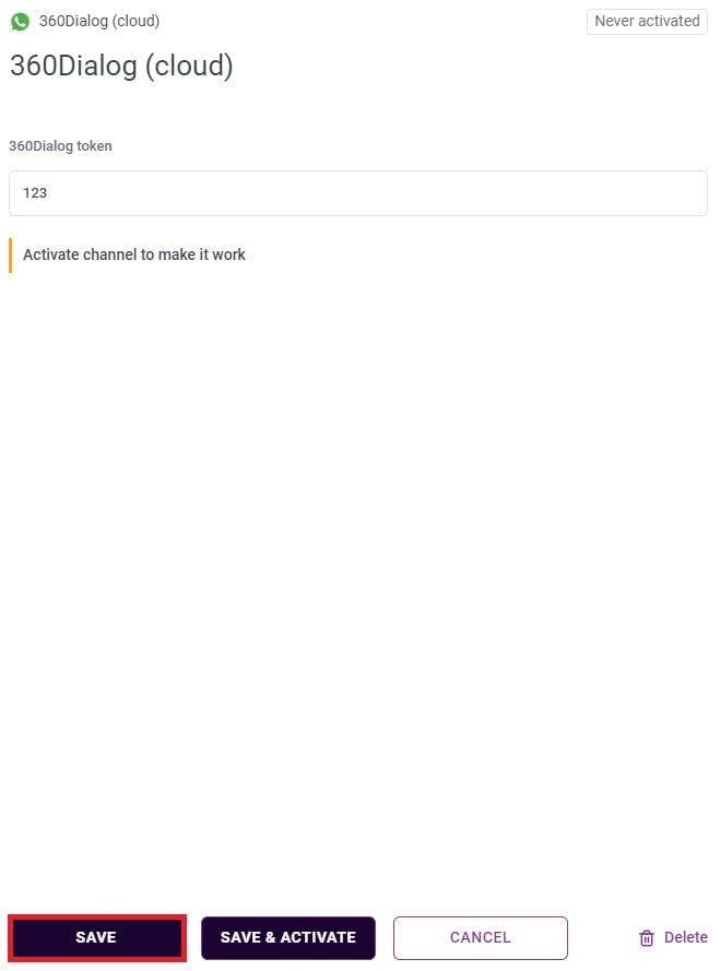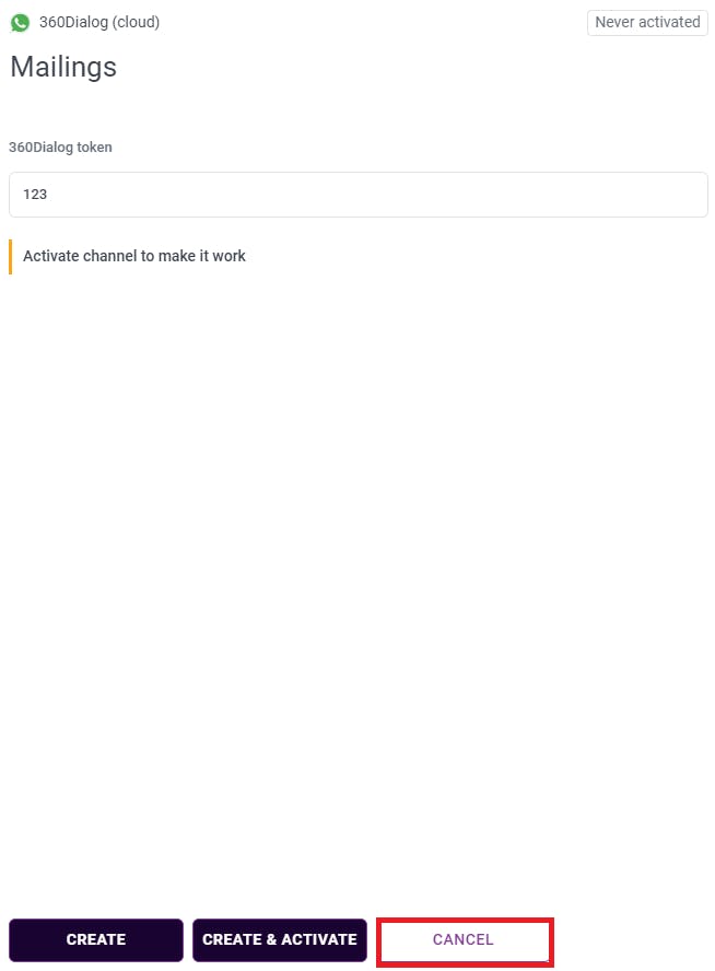 2. Create a channel (without this the cannot be saved). Important: only one can be connected to one WABA.