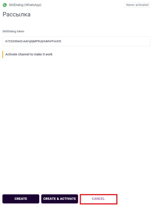 The token in the 360Dialog token field is unique (there are no active channels of the same type with the same token);